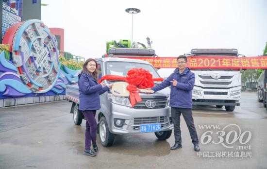 在一片热烈喜庆的氛围中,中联重科混凝土机械营销公司副总经理张良、 一汽解放青岛汽车有限公司专用车部销售经理韩明浩为冠亚季军,颁发红旗H5轿车、解放皮卡、2万元加油充值卡等大奖,以表彰先进树立典型,激励一线将士虎年再创辉煌。