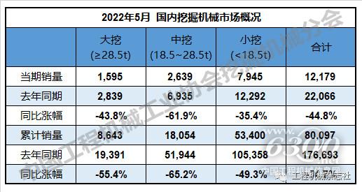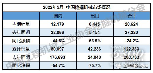 2022年1—5月,共计销售各类挖掘机械产品122333台,同比下降39.1%。其中,国内市场销量80097台,同比下降54.7%;出口销量42236台,同比增长75.7%。