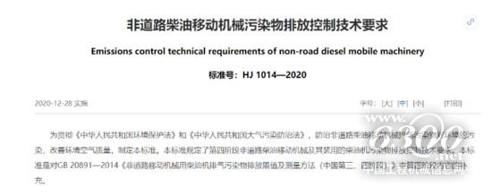 2020年12月, 生态环境部与国家市场监督管理总局联合发布了《非道路移动机械用柴油机排气污染物排放限值及测量方法(中国第三、四阶段)》(GB 20891-2014)修改单,并发布了其配套技术规范《非道路柴油移动机械污染物排放控制技术要求》(HJ1014-2020)。