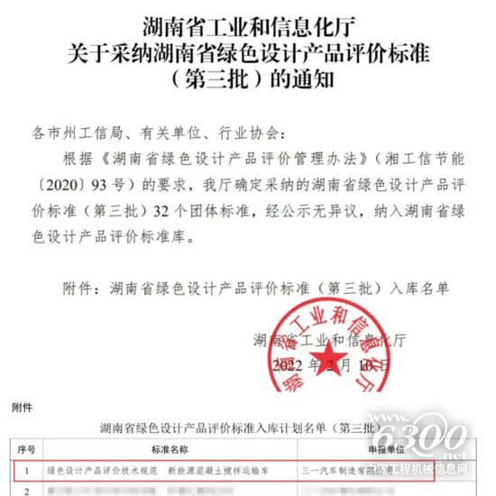 年初,湖南省工业和信息厅对湖南省绿色设计产品名单进行公示,由三一汽车制造有限公司牵头编制的《绿色设计产品评价技术规范 新能源混凝土搅拌运输车》(T/CSTE 0029—2021)已被湖南省工信厅纳入湖南省绿色设计产品评价标准库(第三批)。