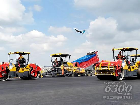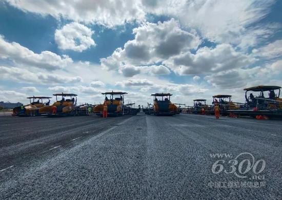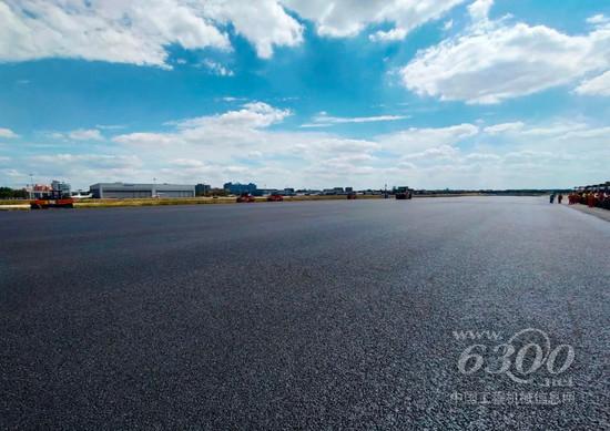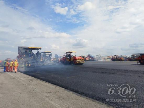 施工现场,摊铺路面长3.2km,宽60m,11条联络道面积7000m² ,徐工道路机械出动10台XD133D双钢轮压路机、7台RP1253T摊铺机、1台RP1355T摊铺机轮番登场,在高等级路面的道路面层进行沥青罩面。