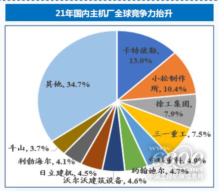 其实,近几年海外市场已成工程机械的主战场。据英国KHL统计,2021年徐工(集团)、 三一、中联的工程机械全品类综合市占率分别为7.9%/7.5%/4.9%,全球排名提升至3-5位,同时Off-Highway Research的数据也显示2020 年三一首次夺得全球挖机销量冠军,单品类市占率达15%,叠加疫情期间国内龙头主机厂的ROE水平已超越卡特彼勒、小松等国际巨头,全球竞争力抬升明显。