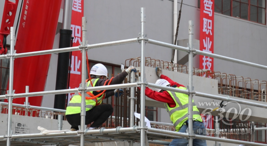 参加此项比赛的共9支队伍,每支队伍7人,其中3名辅助工,他们需要在4个小时内成功搭设一栋整体装配式框架结构的工法楼。选手们从构件吊装准备、引导就位到安装校正,有条不紊地操作着。一旁的3台三一起重机高举大臂,与他们紧密配合。