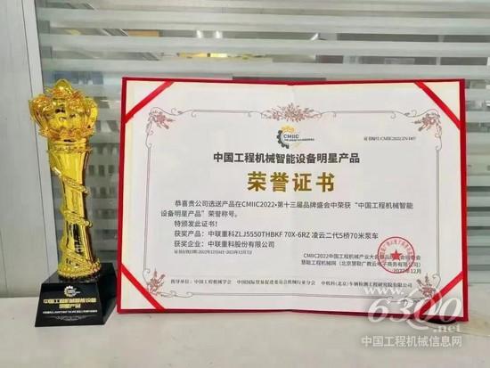 ▲中联重科70米泵车获评“中国工程机械智能设备明星产品”