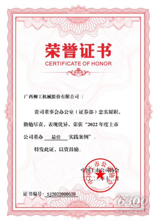 近日,中国上市公司协会(简称:中上协)发布“2022年上市公司董事会秘书履职评价”结果及“2022上市公司董办最佳实践”评选结果。广西柳工机械股份有限公司荣获“2022年度上市公司董办最佳实践案例”,公司董事会秘书黄华琳荣获“2022年上市公司董事会秘书履职评价5A级”。柳工凭借规范性治理结构、高质量治理效能、围绕公司核心能力的资本运作、积极践行社会责任等卓越表现,成为工程机械行业和广西唯一获此殊荣企业。