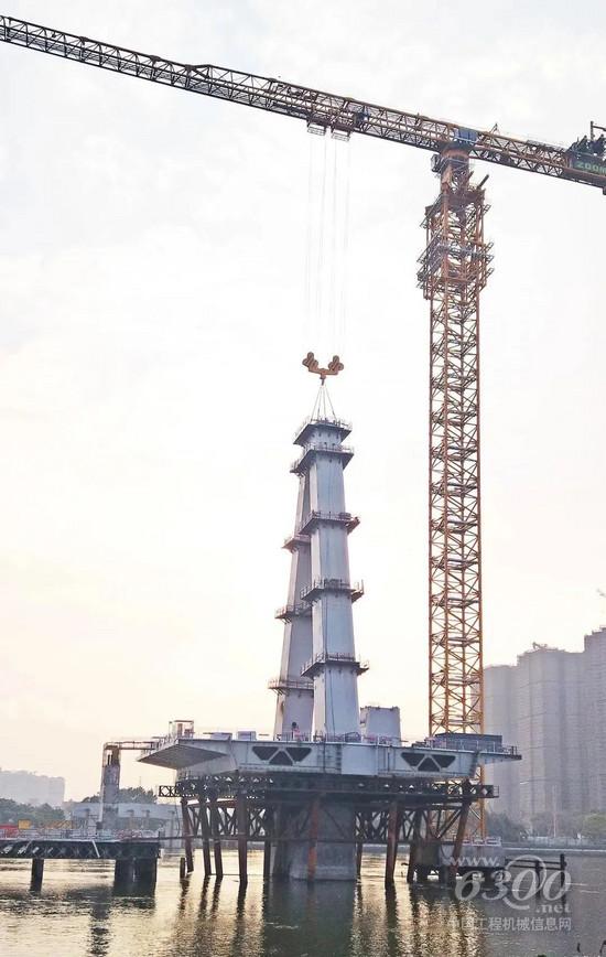 为提升建设速度、尽量减少施工影响,项目方采取装配式施工,先制作好大量预制构件,再拉到现场的设计位置进行拼装,以“搭积木”的方式建桥。由于建设过程涉及水上作业、大件吊装等重大方案,还具有制作安装精度要求高、重型吊装作业量大、协调工作接口多等特点,为保证预制结构顺利起吊安装,项目方、租赁公司携手中联重科,量身定做了超大型塔机R4300-200。