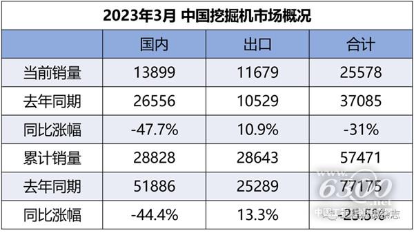 据中国工程机械工业协会对挖掘机主要制造企业统计,2023年3月销售各类挖掘机25578台,同比下降31%,其中国内13899台,同比下降47.7%;出口11679台,同比增长10.9%。