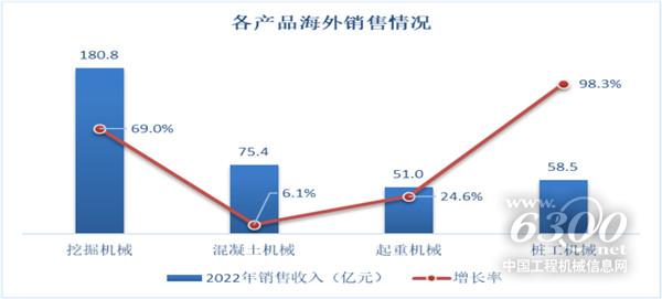 2022年,三一共推出79款符合国际标准的产品,欧美产品覆盖率超70%,助推海外销售额快速增长。挖掘机械、混凝土机械、起重机械在海外市场的销售额分别为180.8亿、75.4亿和51亿元,同比增长69%、6.1%和24.6%。