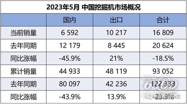 据中国工程机械工业协会对挖掘机主要制造企业统计,2023年5月销售各类挖掘机16809台,同比下降18.5%,其中国内6592台,同比下降45.9%;出口10217台,同比增长21%。