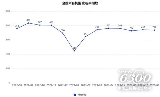 2023年8月升降工作平台出租率为737点,环比、同比均出现略降态势。14~16m、30~35m、36~39m和40m以上4类机型出租率环比上涨,其中40m以上臂车涨幅最大,达到10.8%;≤6m 、8~12m和20~24m出租率环比出现下滑,8~12m下滑幅度最大,达到8.6%;26~28m机型出租率比较平稳,环比基本不变。与去年同期相比,除36~39m和40m以上机型出租率保持上涨趋势外,其他机型均出现不同程度的下降,其中,40m以上机型同比涨幅最大,达到14%,20~24m同比跌幅最大,达到11.9%。(出租率是以台天数为基准进行计算,100%出租率对应1000点。)