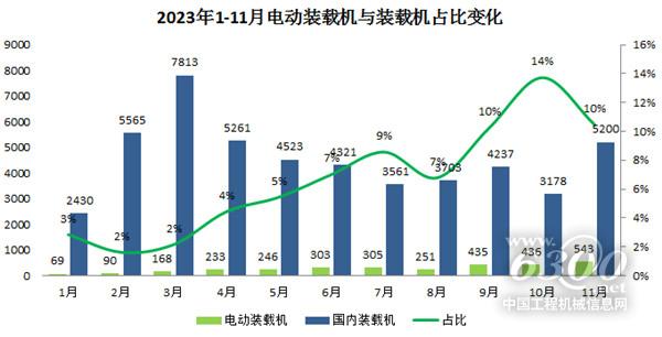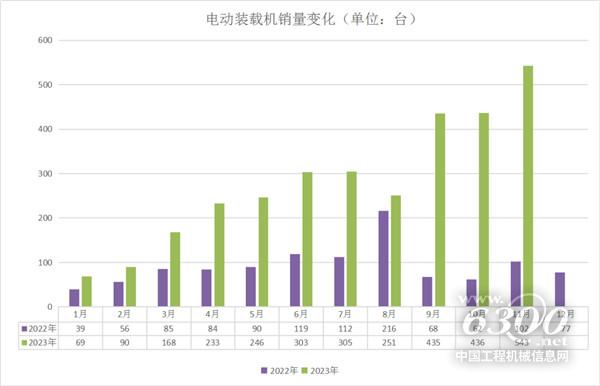 通过2022年和2023年电动装载机销量对比来看:1-11月中,有4月、5月、6月、7月、9月、10月、11月共计7个月实现翻番甚至翻几番增长。其中,9月同比增长540%、10月同比增长603%、11月同比增长432%,增长率十分惊人。