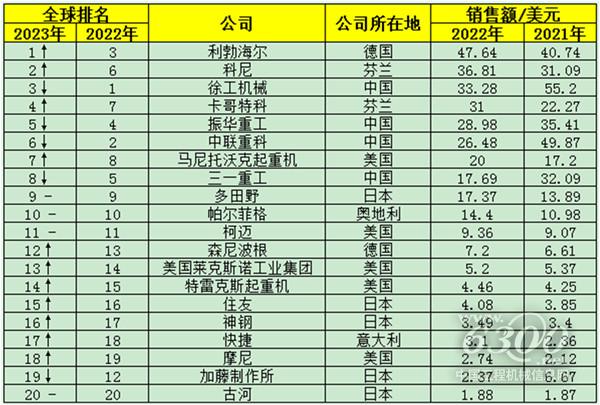 2.全球最大起重机制造商20强,中国企业排名下降;