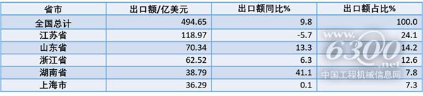 其中,2023年工程机械出口的前五个省份分别为:江苏、山东、浙江、湖南以及上海。