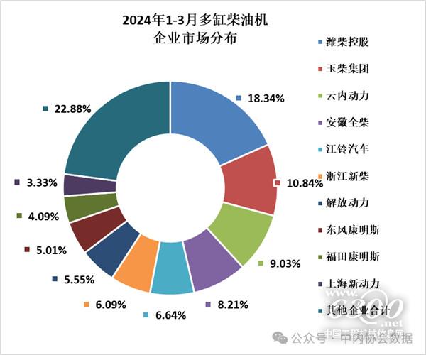 3月,多缸柴油机企业共销量45.71万台,环比增长66.29%,同比增长-8.45%;1-3月累计销量112.55万台,同比增长-1.14%。潍柴、玉柴、云内、全柴、江铃、新柴、解放动力、东康、福康、上海新动力销量居前十名,占多缸柴油机总销量的77.12%;市场份额占比中:潍柴18.34%、玉柴10.84%、云内9.03%、全柴8.21%、江铃6.64%、新柴6.09%、解放动力5.55%、东康5.01%、福康4.09%、上海新动力3.33%。3月,工程机械用多缸柴油机销量9.51万台,环比增长90.95%,同比增长-14.38%;1-3月累计销量22.45万台,同比增长-11.65%。销量前十的为新柴、全柴、潍柴、云内、玉柴、东康、卡特彼勒、解放动力、广康、上海新动力,其前十名销量占其总销量97.05%。