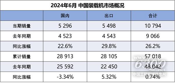 据中国工程机械工业协会对装载机主要制造企业统计,2024年6月销售各类装载机10794台,同比增长26.2%。其中国内市场销量5296台,同比增长22.6%;出口销量5498台,同比增长29.8%。