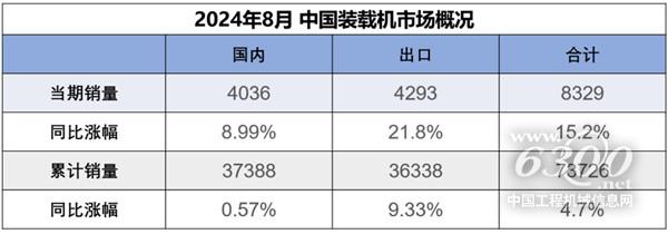 据中国工程机械工业协会对装载机主要制造企业统计,2024年8月销售各类装载机8329台,同比增长15.2%。其中:国内市场销量4036台,同比增长8.99%;出口销量4293台,同比增长21.8%。