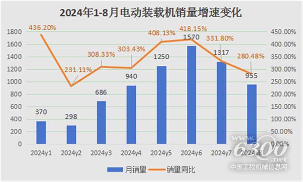根据行业协会官方统计:2024年8月销售电动装载机955台(3吨13台,5吨791台,6吨126台,7吨24台,8吨1台),同比增长280.48%,单月电动化渗透率11.5%。1-8月电动装载机累计销量为7386台,同比增长343.60%,渗透率为10.02%。按照单月电装1000余台销量测算,全年电动装载机累计销量有望突破1万台以上。