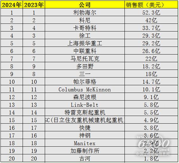 3. 全球最大起重机制造商20强发布,销售总额大幅增长;