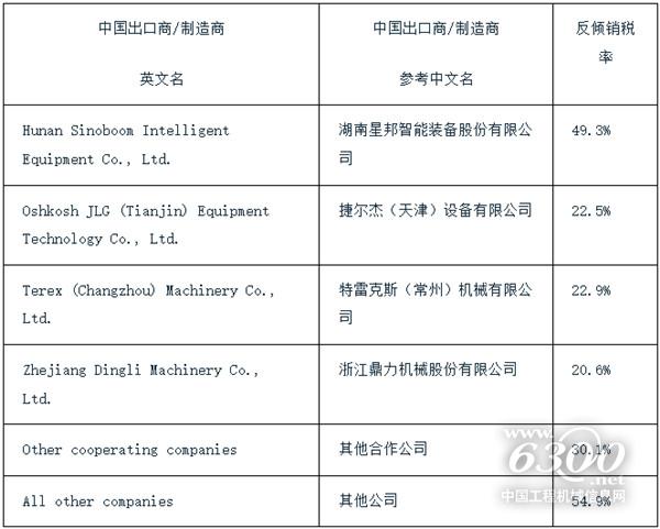 ▲ 欧盟对华移动式升降作业平台反倾销终裁征税表