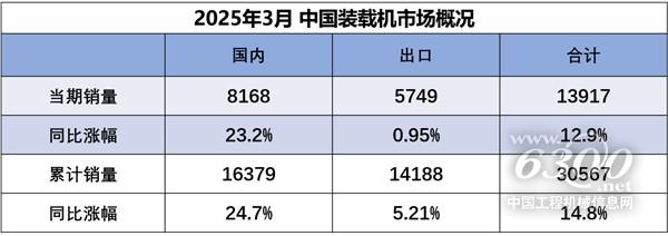 据中国工程机械工业协会对装载机主要制造企业统计,2025年3月销售各类装载机13917台,同比增长12.9%。其中国内销量8168台,同比增长23.2%;出口量5749台,同比增长0.95%。
