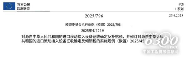近日,欧盟委员会发表声明表示,欧盟于4月25日开始对中国移动升降设备(MAE)征收7.3%至14.2%的反补贴税,这是在2025年1月已征收的反倾销税基础上加征的,两种关税合计使对此类产品的总税率达到20.6%至66.7%。