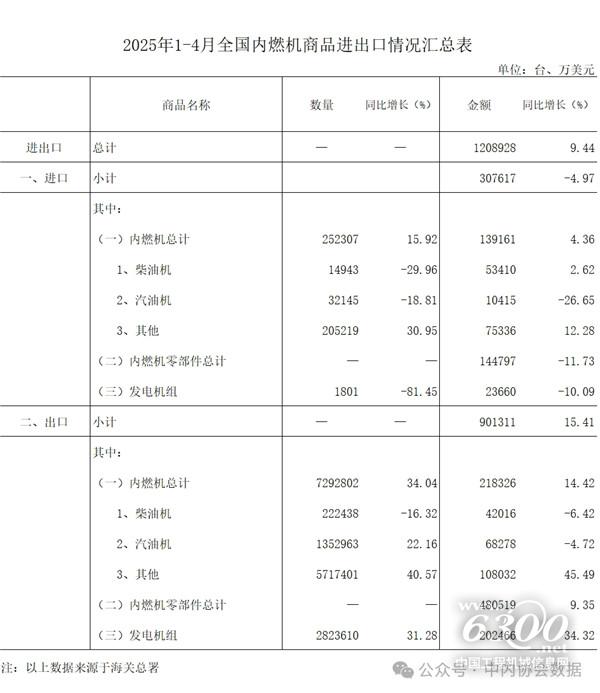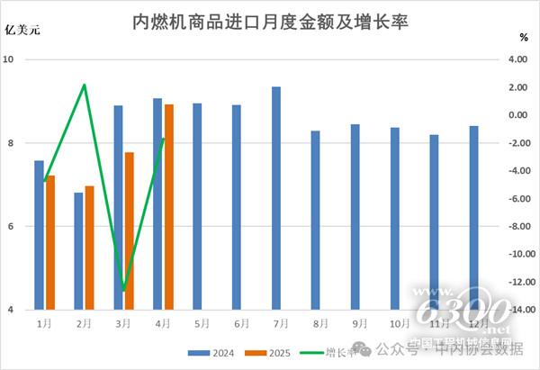 据海关总署数据整理,2025年1-4月内燃机行业进出口总额120.89亿美元,同比增长9.44%,其中,进口30.76亿美元,同比增长-4.97%,出口90.13亿美元,同比增长15.11%。