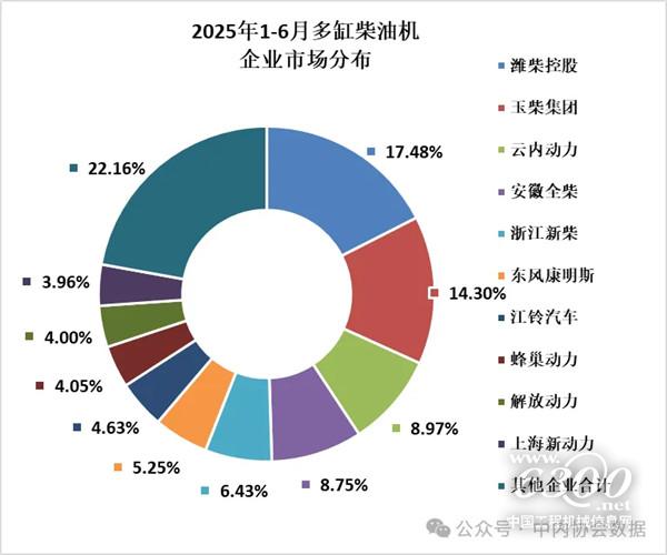 6月,多缸柴油机企业共销量32.97万台,环比增长3.28%,同比增长9.74%;1-6月累计销量215.41万台,同比增长3.84%。潍柴、玉柴、云内、全柴、新柴、东康、江铃、蜂巢动力、解放动力、新动力科技销量居前十名,占多缸柴油机总销量的77.84%;市场份额占比中:潍柴17.48%、玉柴14.30%、云内8.97%、全柴8.75%、新柴6.43%、东康5.25%、江铃4.63%、蜂巢动力4.05%、解放动力4.00%、新动力科技3.96%。