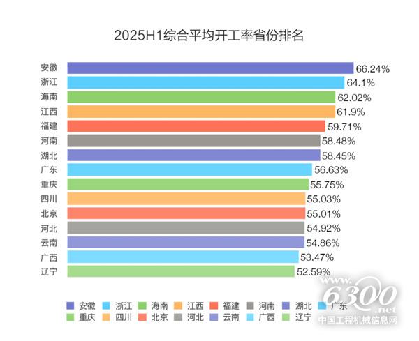 2025年上半年,全国基建项目平稳推进,全国工程机械平均开工率为44.81%。其中,第二季度开工率为47.1%,环比一季度上涨4.62%。15个省份平均开工率超过50%。