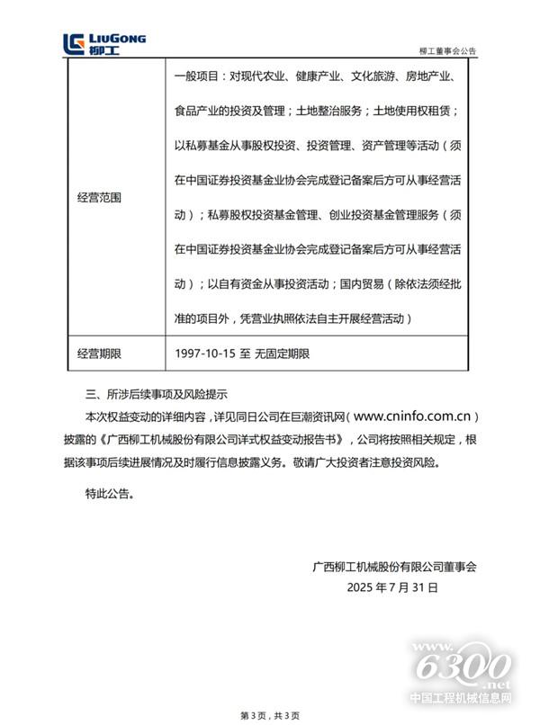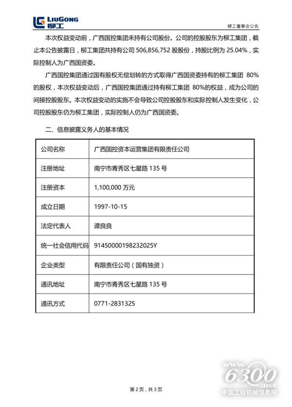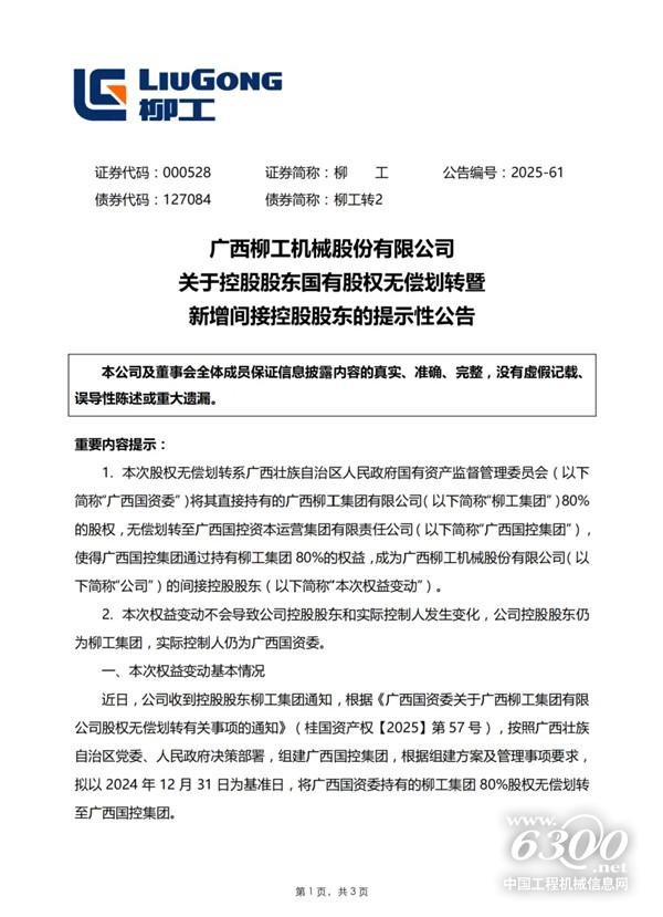 需要注意的是,本次变动之后,广西柳工机械股份有限公司的直接控股股东仍为柳工集团,和实际控制人仍为广西国资委发生变更。截至公告披露日,柳工集团目前持有柳工股份约5.07亿股,占总股本的25.04%。