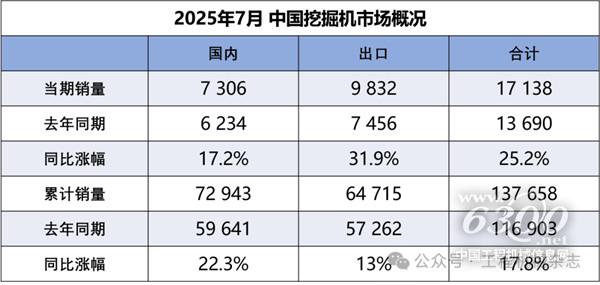 据中国工程机械工业协会对挖掘机主要制造企业统计,2025年7月销售各类挖掘机17138台,同比增长25.2%。其中国内销量7306台,同比增长17.2%;出口量9832台,同比增长31.9%。