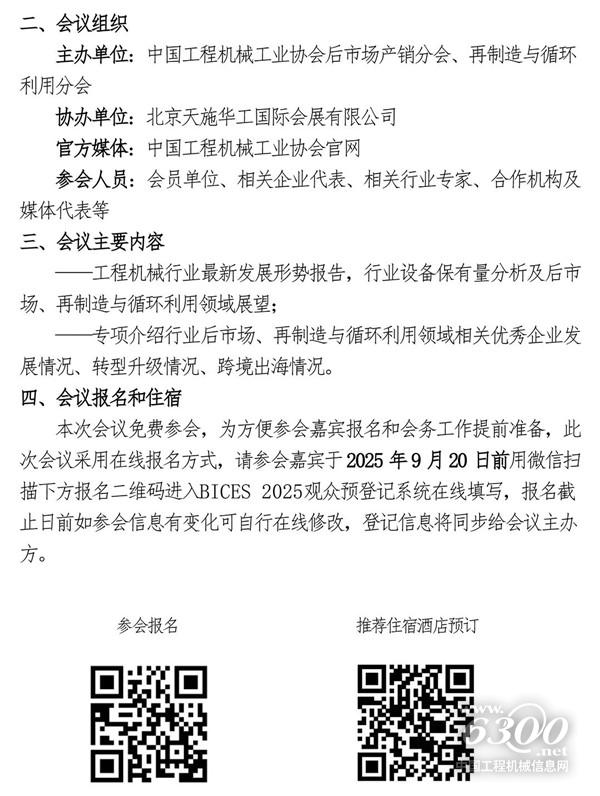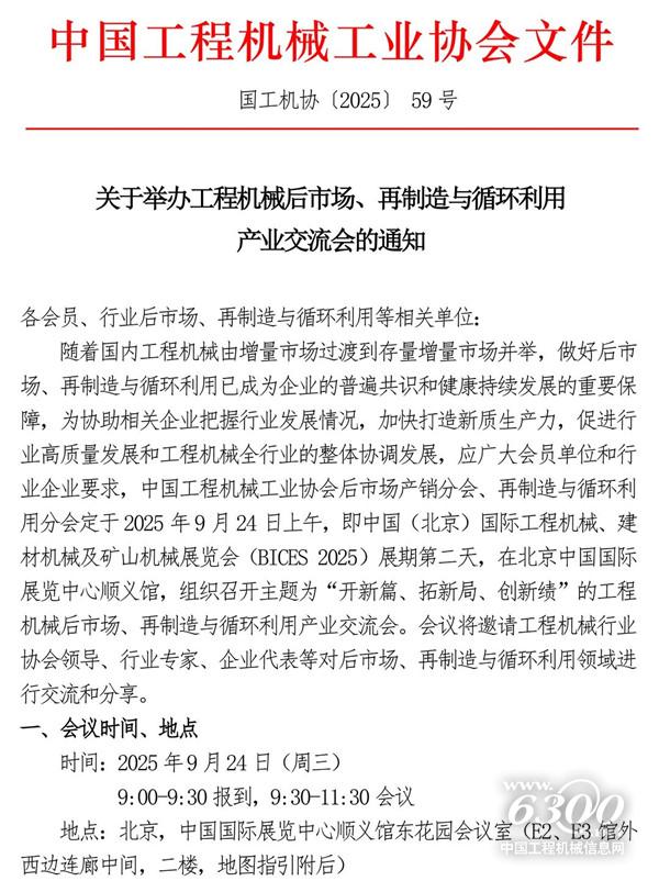 随着国内工程机械由增量市场过渡到存量增量市场并举,做好后市场、再制造与循环利用已成为企业的普遍共识和健康持续发展的重要保障,为协助相关企业把握行业发展情况,加快打造新质生产力,促进行业高质量发展和工程机械全行业的整体协调发展,应广大会员单位和行业企业要求,中国工程机械工业协会后市场产销分会、再制造与循环利用分会定于2025年9月24日上午,即中国(北京)国际工程机械、建材机械及矿山机械展览会(BICES 2025)展期第二天,在北京中国国际展览中心顺义馆,组织召开主题为“开新篇、拓新局、创新绩”的工程机械后市场、再制造与循环利用产业交流会。会议将邀请工程机械行业协会领导、行业专家、企业代表等对后市场、再制造与循环利用领域进行交流和分享。
