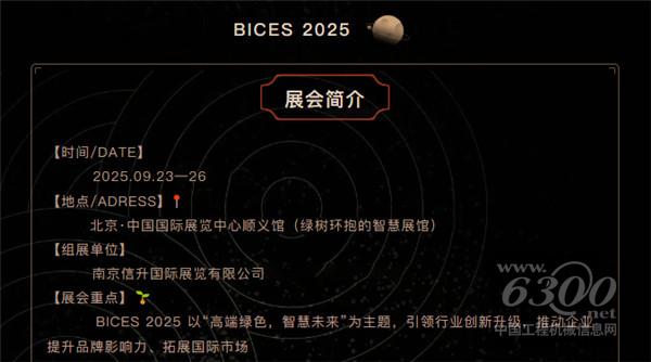 工程机械、建材及矿山机械行业的年度大戏——BICES 2025要来啦!2025年9月23—26日,展会为期4天,就在北京国际展览中心新馆,超15万m²超大场地,近1400家参展商齐聚,覆盖工程机械、建材机械、矿山机械、商用车辆、应急装备等多个领域。展品从常见的挖掘机、起重机,到智能建筑设备、新能源工程车辆,还有各类关键零部件与先进技术服务方案,尽显行业最新成果与企业创新实力。