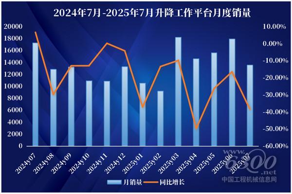 据统计,2025年7月当月销售各类升降工作平台13559台,同比下降38.3%,其中国内销量5098台,同比下降51.4%;出口量8461台,同比下降26.3%。