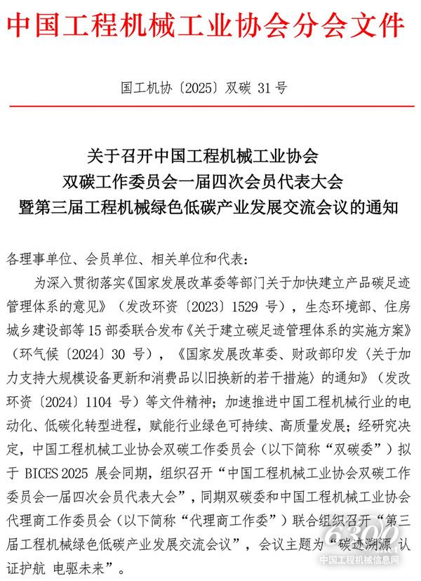 为深入贯彻落实《国家发展改革委等部门关于加快建立产品碳足迹管理体系的意见》(发改环资〔2023〕1529号),生态环境部、住房城乡建设部等15部委联合发布《关于建立碳足迹管理体系的实施方案》(环气候〔2024〕30号),《国家发展改革委、财政部印发〈关于加力支持大规模设备更新和消费品以旧换新的若干措施〉的通知》(发改环资〔2024〕1104号)等文件精神;加速推进中国工程机械行业的电动化、低碳化转型进程,赋能行业绿色可持续、高质量发展;经研究决定,中国工程机械工业协会双碳工作委员会(以下简称“双碳委”)拟于 BICES 2025 展会同期,组织召开“中国工程机械工业协会双碳工作委员会一届四次会员代表大会”,同期双碳委和中国工程机械工业协会代理商工作委员会(以下简称“代理商工作委”)联合组织召开“第三届工程机械绿色低碳产业发展交流会议”,会议主题为“碳迹溯源 认证护航 电驱未来”。