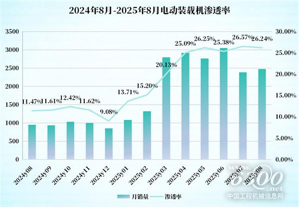 2025年以来,电动装载机单月渗透率呈现稳健攀升态势,从年初的13.71%一路跃升,4月突破25%大关,7月更是创下26.57%的历史新高,8月仍保持在26%以上高位,体现了电动装载机市场接受度指数级提升和供应链的全面成熟。