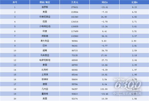 主要市场中,对俄罗斯和美国出口明显下降,占比分别降至8.23%和6.53%;而对印尼、沙特、印度、阿联酋、澳大利亚、越南、马来西亚、哈萨克斯坦、泰国、土耳其、几内亚等国的出口保持良好增长态势。