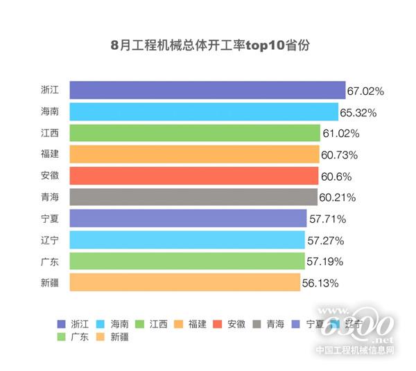 8月份,全国工程机械平均开工率为43.42%。综合开工率排名前十的省份分别是:浙江、海南、江西、福建、安徽、青海、宁夏、辽宁、广东和新疆。其中,全国共有17个省份开工率超过50%。