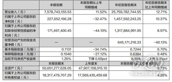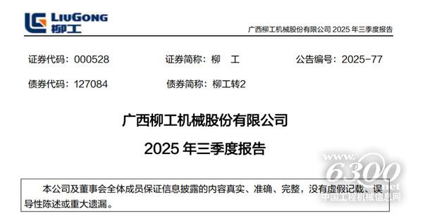 2025年第三季度,柳工实现营业收入75.79亿元,同比增长11.52%;归母净利润2.28亿元,同比下降32.47%。