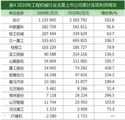 2010年随着市场销售的增长,在各单位加强预算管理的基础上,14家公司全部保持了大幅度的增长,其中厦工股份增长428.7%,常林股份增长296.5%,安徽合力增长234.2%,星马汽车增长199.4%。增长超过100%的单位还有三一重工、龙工控股、山推股份、山河智能。北方股份增长幅度最低,也达到了57.4%。
