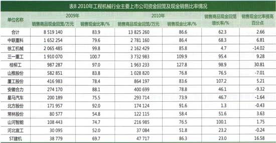 2010年行业14家公司营业收入累计1596.36亿元,同比增长57.3%。销售产品资金回收1382.5亿元,同比增长62.3%。销售现金比率为86.6%,同比增加2.66个百分点。14家公司的具体资金数据见表8。