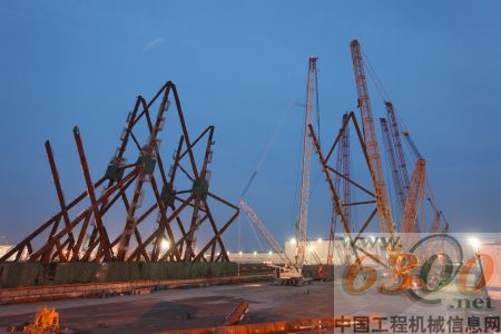 4月17日,在山东蓬莱海洋石油平台建造工程中,徐工第2台千吨级履带起重机与德马格5台履带起重机联合作业,在载荷90%的情况下带载行走,顺利将高达96米、重达650余吨的深海导管,吊接到200多米远的主结构件上,成功挑战海洋工程施工领域极限。