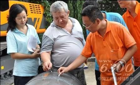 会谈结束后,来访人员在公司相关部门负责人的陪同下,来到公司装配分厂,实地查看合同产品,并对挖掘机的油缸、长臂、驾驶室等部位进行仔细检查核对。