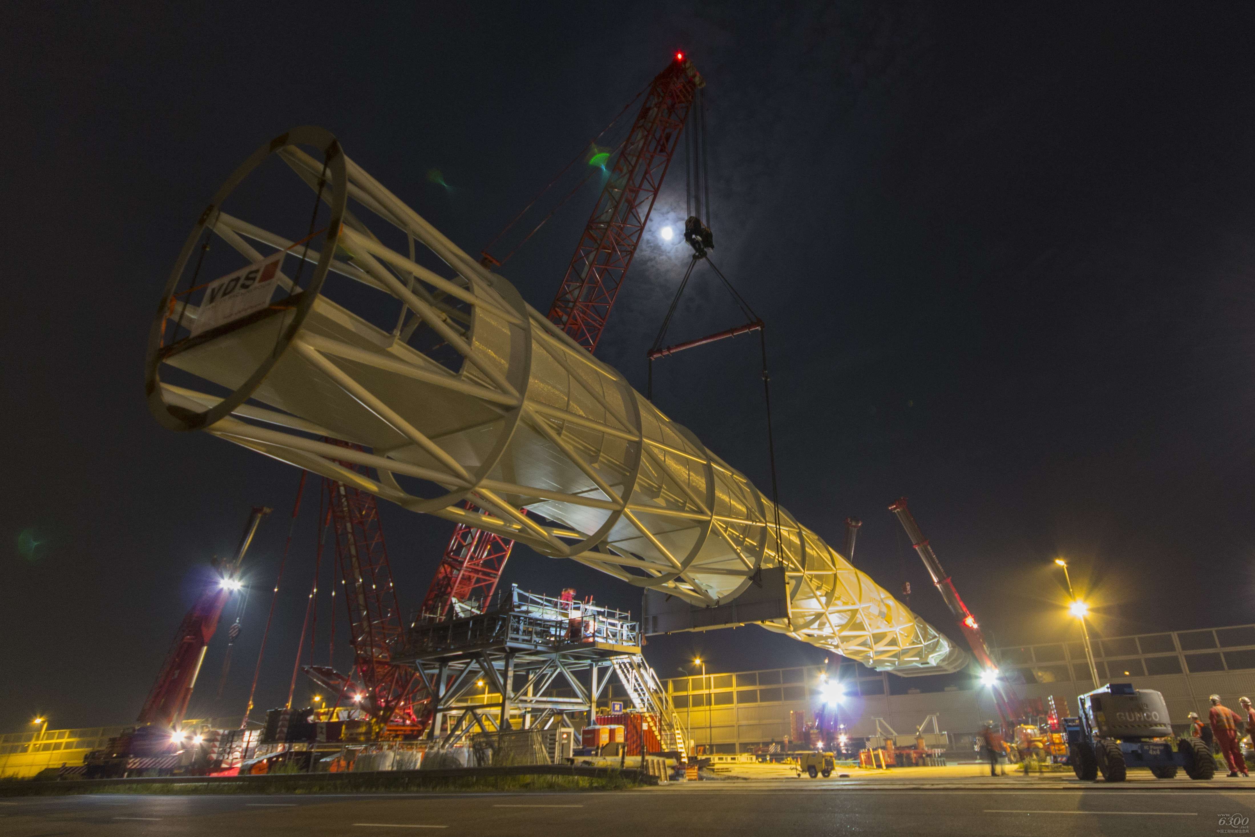 架设过程中,特雷克斯起重机简单的装配设计为工作组提供了极大的便利。Wagenborg 工作组驾驶着两台 AC 500-1 全路面起重机前往现场,每台起重机配备三辆运输车。架设速度十分快,不到一个小时,两台 AC 500-1 起重机都已准备就绪。每台起重机配有一个长 28.6 米的主臂、160 吨的配重以及 9.6 米的支腿基座。“这一工作只占用了我们的两名成员,”Jack Bienen 说道。另外,公司派遣了 29 辆卡车来运送 CC 2500-1 履带式起重机。四名成员花了一天时间完成了该起重机的架设。该起重机采用超起配置,带有一个 48 米主臂、120 吨配重以及 250 吨超起配重。