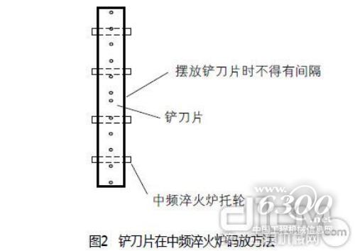 用中频淬火炉对铲刀片淬火时,铲刀片的码放用单臂起重机吊运,不需用人力码放,劳动强度大大降低。铲刀片经加热后,由中频淬火炉的托轮直接将其送入淬火水槽内,不用人力挪动,危险性减小。