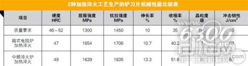 我们从中频淬火炉淬火铲刀片和箱式电阻加热炉淬火铲刀片中各抽取3个进行屈服强度、抗拉强度、伸长率、收缩率、晶粒度、冲击韧性等机械性能试验,试验后取平均值,其结果如附表所示。