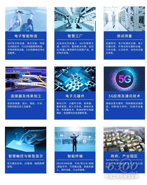 九大专业展区 – 包含电子智能制造、智慧工厂、5G应用及通讯技术、电子元器件、测试测量、智慧触控与新型显示、连接器及线束加工、智能终端,政府、产业园区展区,涵盖电子产业中的主要类别,助力企业打造重点领域产业链竞争优势。