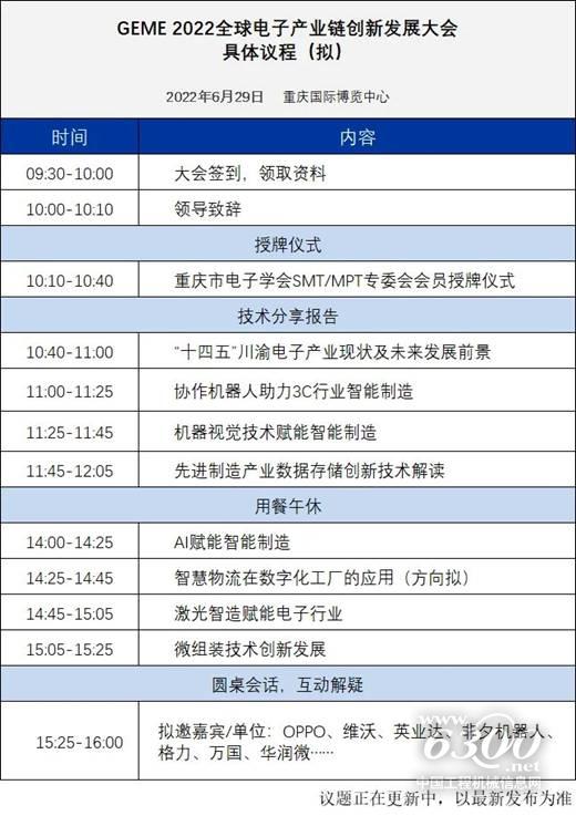 展会同期将举办GEME 2022全球电子产业链创新发展大会,针对"十四五"川渝电子产业现状及未来发展前景、机器视觉技术赋能智能制造、协作机器人助力3C行业智能制造、先进制造业数据存储创新技术解读、智慧物流在数字化工厂的应用、激光智造赋能电子行业、微组装技术创新发展”等热点技术议题,进行全面学术交流及技术探讨。