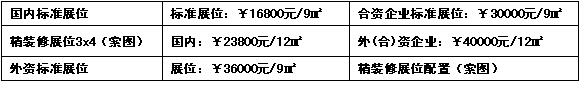 1、标准展位9m²(3m×3m);配置:展出场地、三面展板(高2.5m)、一块中英文楣板 、一 张洽谈桌、二把椅子、地毯、220V电源插座一个、二支射灯。  (注:双开口展位加收20%)