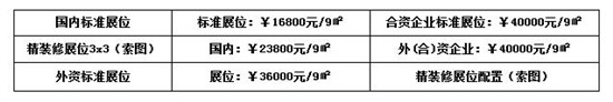 1、标准展位9m²(3m×3m);配置:展出场地、三面展板(高2.5m)、一块中英文楣板、一 张洽谈桌、二把椅子、地毯、220V电源插座一个、二支射灯。 (注:双开口展位加收20%)