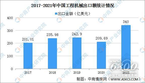 2021年中国工程机械出口金额突破300亿美元达到340亿美元,同比增长62.3%。其中大型挖掘机、履带起重机、电动叉车、大型非公路自卸车等高端工程机械出口增长较快。其中,对“一带一路”沿线国家出口额占全部出口额的42.4%,同比增长达60.4%。